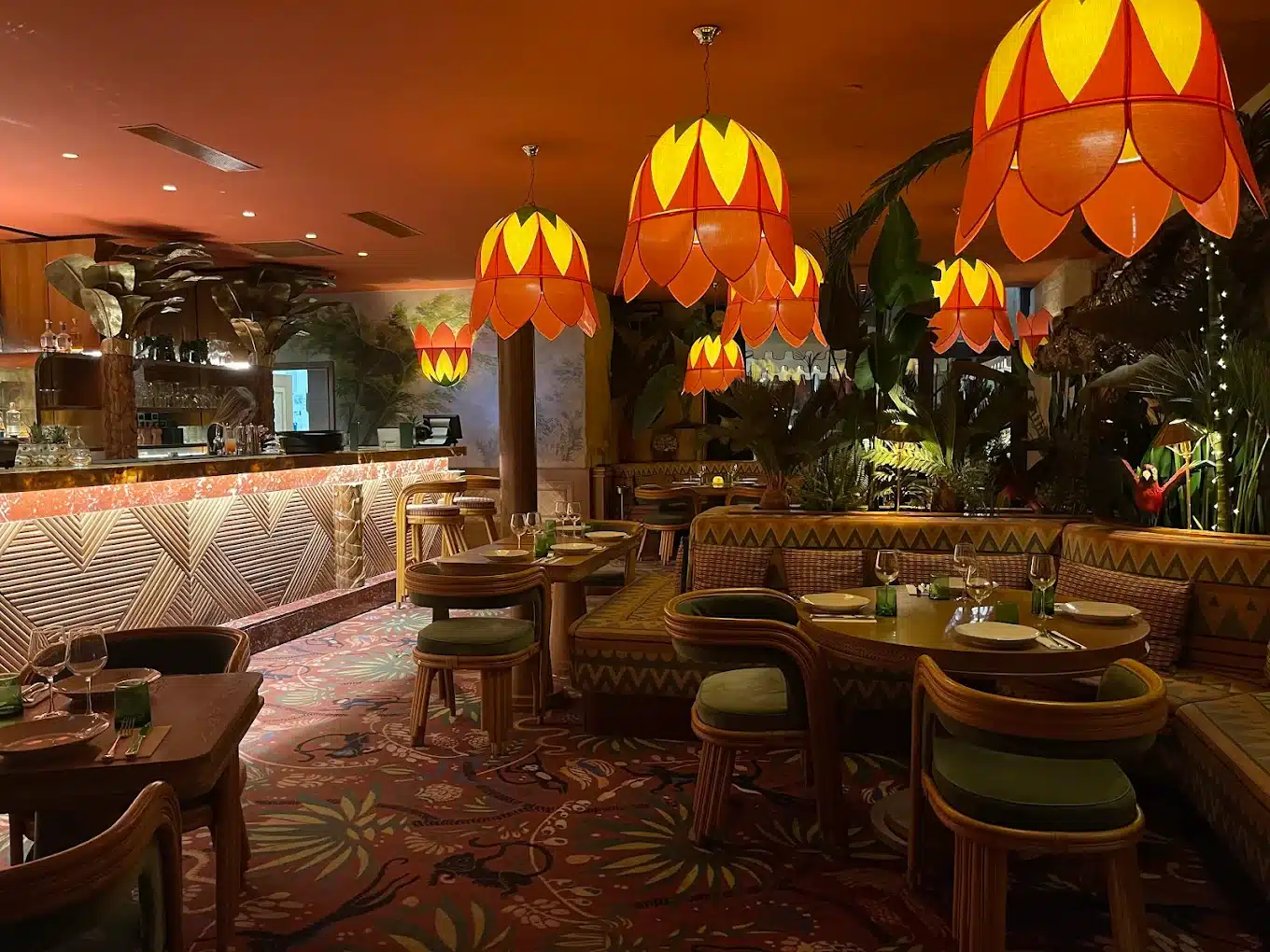 Il suffit de lever les yeux ou de longer les banquettes pour comprendre combien l’immersion a été pensée jusque dans les moindres nuances. Mobiliers en rotin, coussins bigarrés, murs tapissés de motifs végétaux… Le contraste entre la structure historique de la voûte et cette profusion de vert crée un effet spectaculaire.